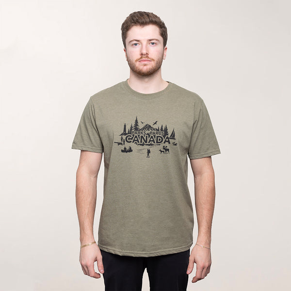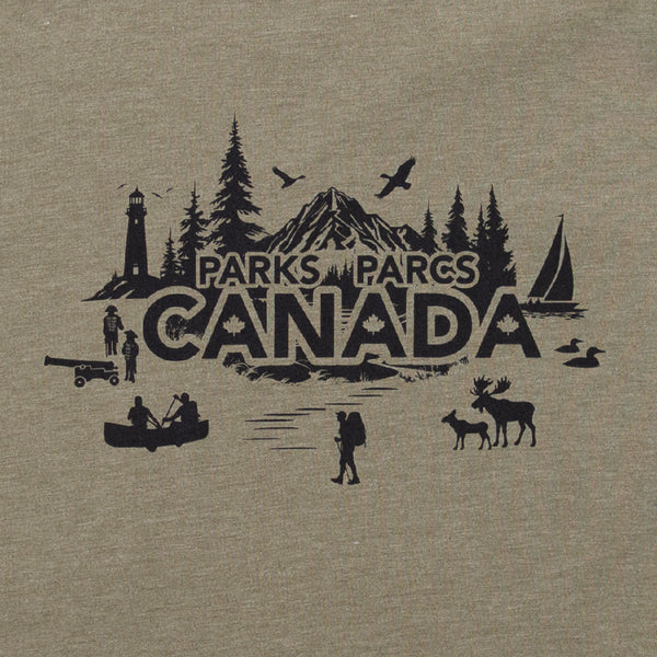 Ce t-shirt unisexe arbore un graphisme noir de Parcs Canada au centre sur le devant, qui met en valeur certains éléments clés des différents sites de Parcs Canada, ainsi que le logo du castor de Parcs Canada au centre de la nuque.