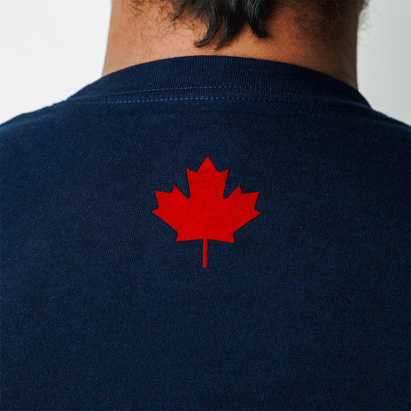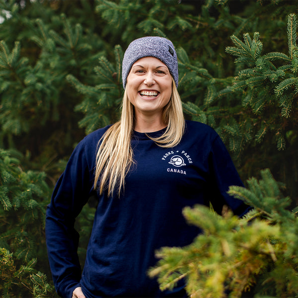 Ce t-shirt unisexe à manches longues présente un col ras du cou en tricot côtelé et une coupe classique qui tombe sous la taille. Il est parfait pour toutes les aventures. Il est orné d'un motif blanc floqué Parcs Canada sur la poitrine gauche et d'une feuille d'érable rouge au centre de la nuque.
